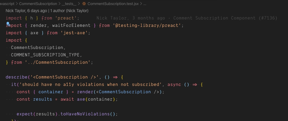 A typical a11y test in a component test file looks like this.